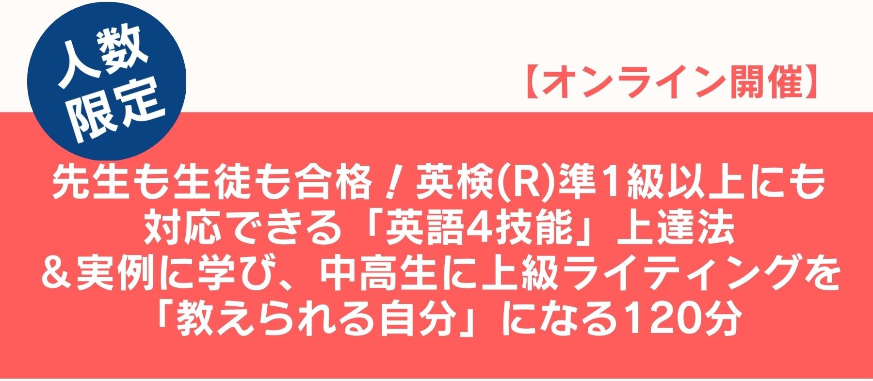英検(R)上位級など、ご自身のスキル、または中高生のライティング指導に不安を感じている英語講師のための、オンライン実践セミナーです。